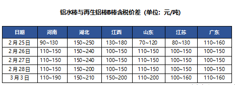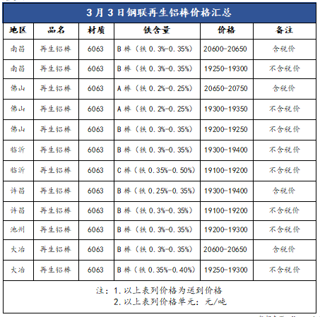 3月3日A00铝锭现货价华东20630,涨40;华南20610,涨30;中原20540,涨50(单位:元/吨)。下游按需少量采买,观望居多,今日再生铝棒价格持平居多。
