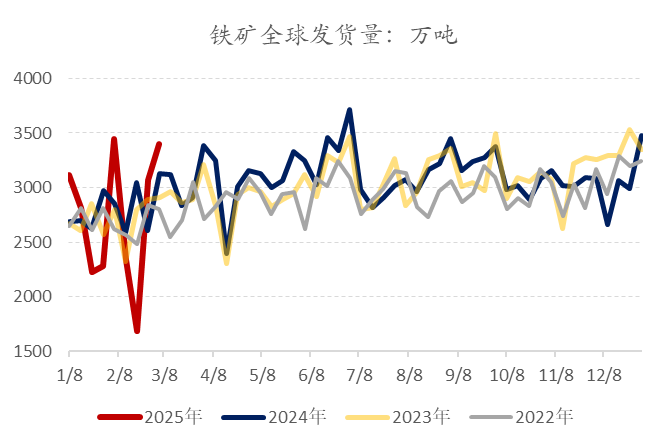 2月份,受南半球热带气旋和暴雨天气影响,澳洲和巴西两大主要铁矿产出国的铁矿发运量显著下滑,创出历史新低水平。铁矿供应呈现出现较为显著的收缩态势。2月末,随着南半球天气影响因素的消除,澳洲和巴西主要矿山的发运量快速恢复,到达历史同期高位水平,以求弥补此前因天气因素而导致的发运量损失。