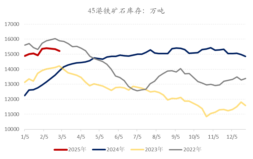 当前,国内港口铁矿库存水平依然较高,库存压力有待消化。上海钢联调研数据显示:国内45港进口铁矿石库存15221万吨,环比下降118万吨,同比增长2275万吨。由此可见,铁矿库存要依然较为显著。