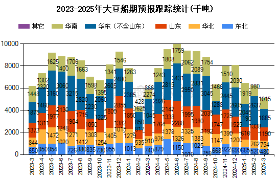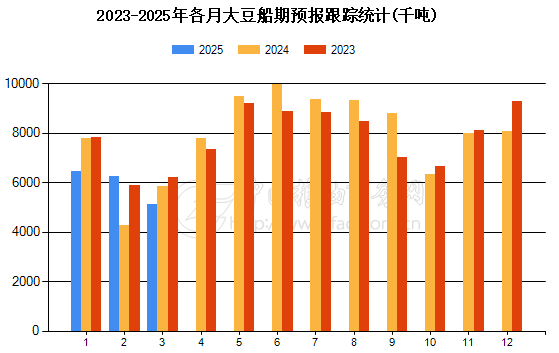 (3)粮油商务网跟踪统计的数据显示,2025年3月大豆到港量为512.4万吨,较上月预报的623.7万吨到港量减少了111.3万吨,环比变化为-17.85%;较去年同期583.5万吨的到港船期量减少71.1万吨,同比变化为-12.19%。