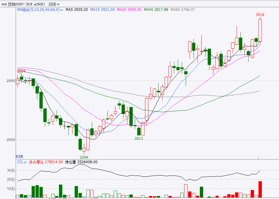 因中美贸易争端升级,国内进口减少,今日国内油料及蛋白粕板块继续走强,其中,豆粕涨幅居前,截至收盘报3007元/吨,日涨79元/吨,涨幅达到2.7%。