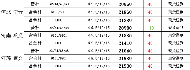 3月3日宁晋市场普铝杆现货报盘价20960元/吨,较上一交易日报价涨40元/吨;巩义市场普铝杆现货报盘价20980元/吨,较上一交易日报价跌10元/吨;宜兴市场普铝杆报盘价21040元/吨,较上一交易日报价涨40元/吨。