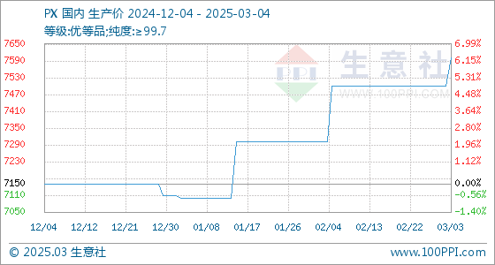 3月4日,生意社PX基准价为7600.00元/吨,与本月初(7500.00元/吨)相比,上涨了1.33%。