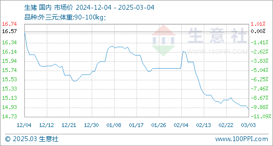 3月4日生意社生猪基准价为14.90元/公斤