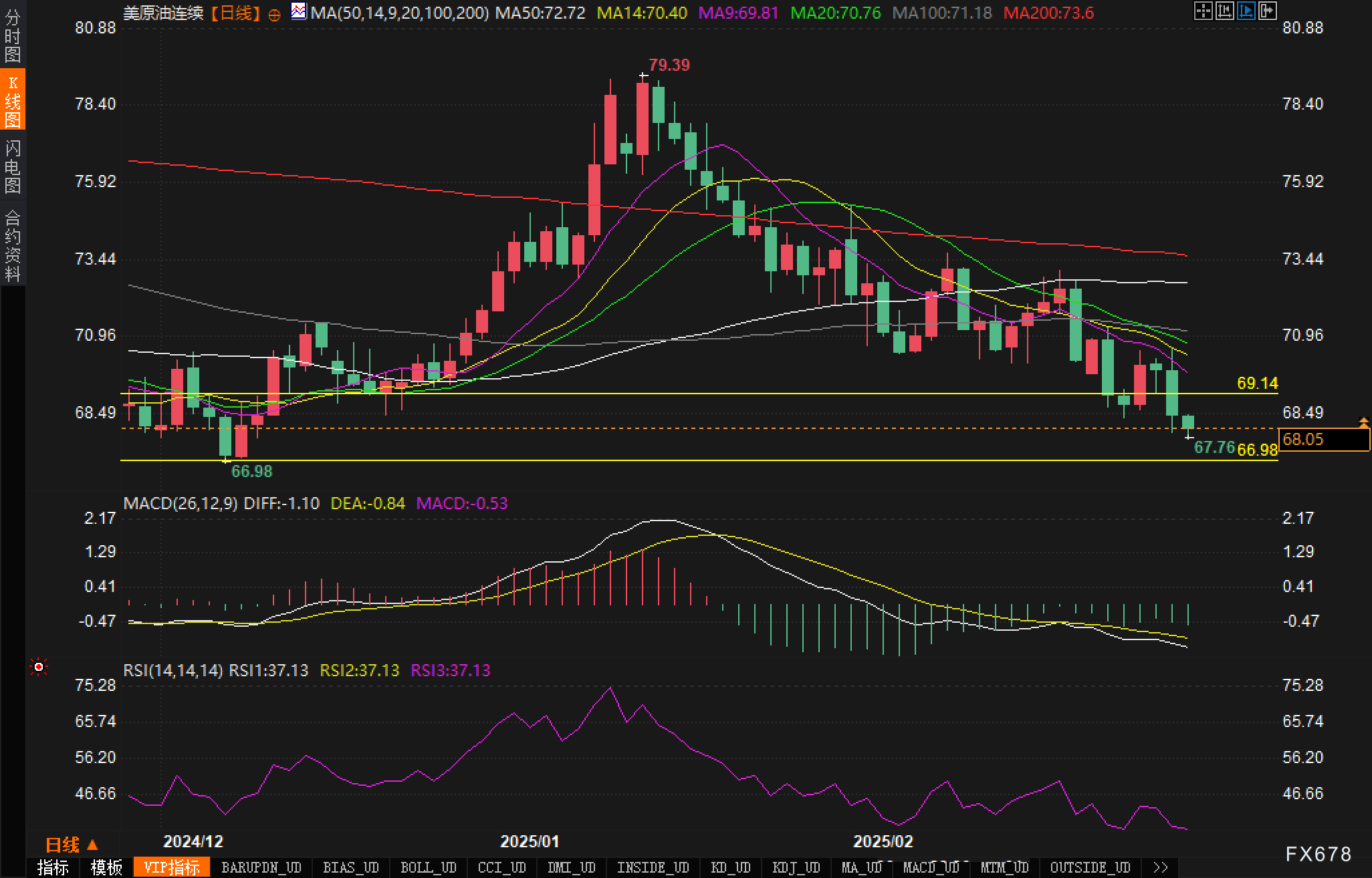 从日K线图形态来看,WTI原油价格已形成明显的下降趋势通道。当前价格68.00美元,不仅跌破了多条重要均线,而且正在测试67.76美元的日内低点支撑。值得注意的是,近期油价已从今年1月初创下的79.39美元高点大幅回落,累计跌幅超过14%,显示市场看空情绪浓厚。