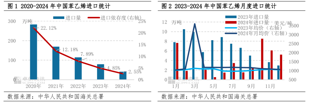 2024年中国苯乙烯月度进口量呈现“量减价涨”趋势: