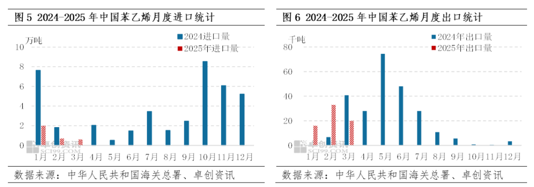 进口方面,中国苯乙烯进口量或维持低位。首先,国内苯乙烯装置的开工负荷预计将保持在70%以上的高位,这意味着国内供应相对充足。其次,需求端处于季节性淡季,港口库存进入累库周期,进一步加剧了国内供应的宽松局面。此外,2025年苯乙烯下游工厂的进口原料长约较去年有所减少,目前仅有一家下游工厂保留了稳定的进口原料合约。根据卓创资讯的调研,预计一季度的苯乙烯进口量在3.3万吨,同比减少65.12%。