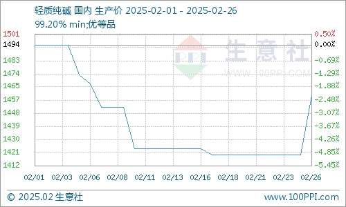 据生意社商品分析系统显示,2月26日轻质纯碱价格上涨,市场均价在1460元/吨,与上一交易日价格1420元/吨相比上调2.82%,较月初跌幅2.28%。2月26日生意社轻质纯碱指数为74.87,较昨日上升了2.05点,较周期内最高点189.10点(2021-11-07)下降了60.41%,较2015年11月18日最低点63.15点上涨了18.56%。(注:周期指2011-09-01至今)