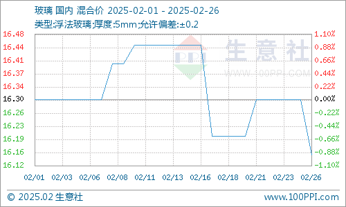 需求方面:据生意社商品分析系统显示,2月26日玻璃价格下调,市场均价在16.15元/平方米,与上一交易日价格16.30元/平方米相比跌幅0.92%。玻璃市场装置变动不大,开工维持平稳,下游补货需求欠佳,市场交投氛围偏弱,玻璃库存累积,市场价格弱势运行。