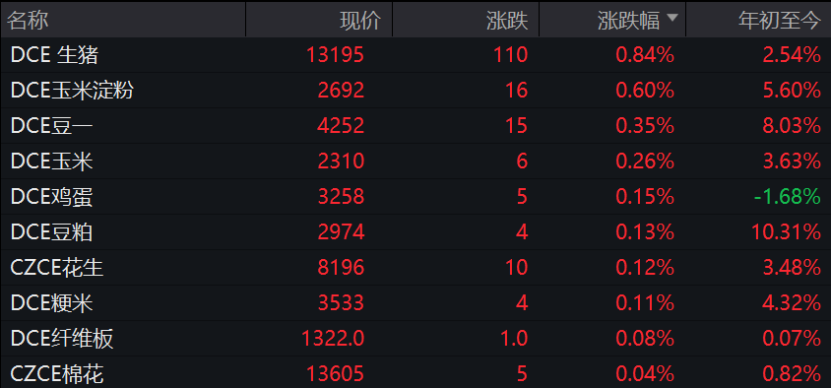 周二午间发布消息后,农产品期货市场迅速反应。午后,国内大豆、玉米、棉花、生猪等期货价格一度快速上行,之后各品种表现分化,生猪期货领涨收盘。