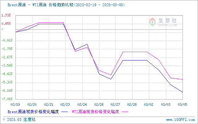进入本轮计价周期,国际油价行情走势下滑,截止4日,美国WTI原油期货主力合约结算价报68.26美元/桶,布伦特原油期货主力合约结算价报71.04美元/桶。本周期内原油价格走势下滑,一方面俄乌地缘局势缓和,美国正在考虑放松对俄罗斯制裁,潜在的供应风险有所减弱,加之产油国计划4月份开始小幅增产,受此消息影响国际原油行情走低;另一方面美国加征关税,市场担忧情绪加重,或将拖累全球经济和需求预期,原油行情受影响走低。截止5日,第十个工作日原油品种变化率为-2.63%,对应国内汽油下调135元/吨,柴油下调130元/吨,折合每升下调92#0.10、95#0.11、0#0.11元。