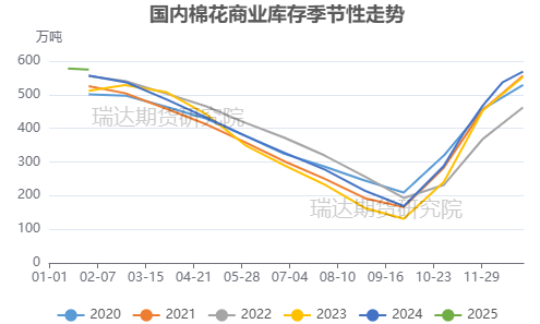 从国内的情况来看,由于我国和美国棉花的种植周期一致,目前依然处在棉花上市的季节。而从目前国内的库存水平来看,库存也存在一定的压力。2025年1月份,随着新季籽棉加工后持续上市,商业库存有所增长,市场供应越发宽松。中国棉花协会公布称,截至1月底,全国棉花商业库存574.7万吨,环比增加6.2万吨,同比增加18万吨,高于往年同期水平。