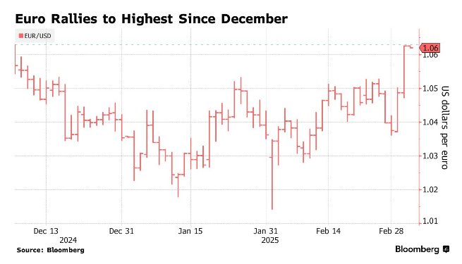 德意志银行和法国兴业银行周二发布报告,押注欧元将跑赢美元,因欧洲采取措施支撑经济并限制美国关税的潜在影响,与此同时,美国经济前景恶化。这些报告发布之际,欧元周二触及1.0627美元,为去年12月以来的最高水平,因德国宣布设立一项国防特别基金,并表示将改革其政府借贷立场。