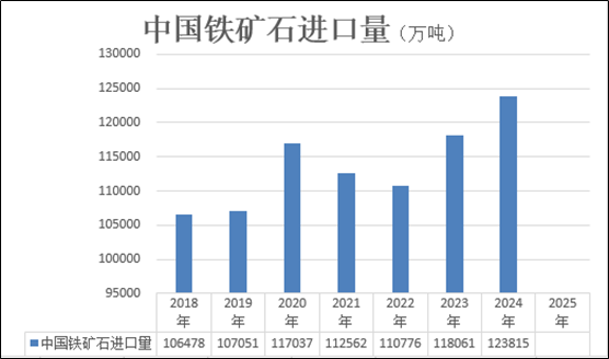 中国作为钢材主产国,铁矿石现货需求大,但国内铁矿石资源贫矿多富矿少,进口依赖度维持在80%上方。据统计,国内铁矿石进口量,2020年以来一直维持在11亿吨的高位水平,2024年更是突破12亿吨,其中主要进口来源澳洲和巴西。