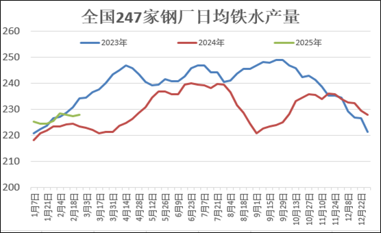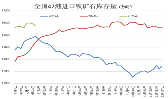 2025年1-2月,全球铁矿石发运远端受天气影响供应收缩,影响国内到港量下滑,港口库存由1.6亿吨下滑至1.57亿吨。只是,中国47港铁矿石库存环比去库,但绝对值仍处于近3年同期高位。后续,发运量和到港量提升,国内铁矿石港口库存将维持高位,并有继续增加的可能。
