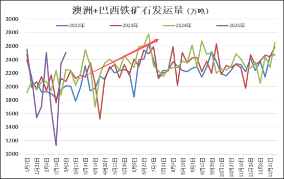 今年1-2月,铁矿石期现货价格相对坚挺更多是受天气扰动,由于一季度是南半球飓风和强降雨等恶劣天气多发期。据悉,2025年1-2月,澳大利亚北部地区出现了飓风和较强降雨;巴西、秘鲁等国的北部和中部地区在1-2月多次遭遇强降雨,部分地区出现大到暴雨。恶劣天气不仅阶段性影响铁矿石开采,还影响发运。据Mysteel统计,截止2025年3月1日,澳巴铁矿石累计发运量为17901.3万吨,同比减少497万吨。从历史数据分析,随着时间推移澳洲和巴西受天气扰动将逐步减弱,铁矿石发运量则稳步增加,并于6月下旬达到峰值。
