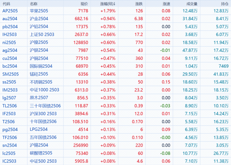 沪深300股指期货(IF)主力合约涨0.31%,上证50股指期货(IH)主力合约涨0.66%,中证500股指期货(IC)主力合约涨0.08%,中证1000股指期货(IM)主力合约涨0.38%。