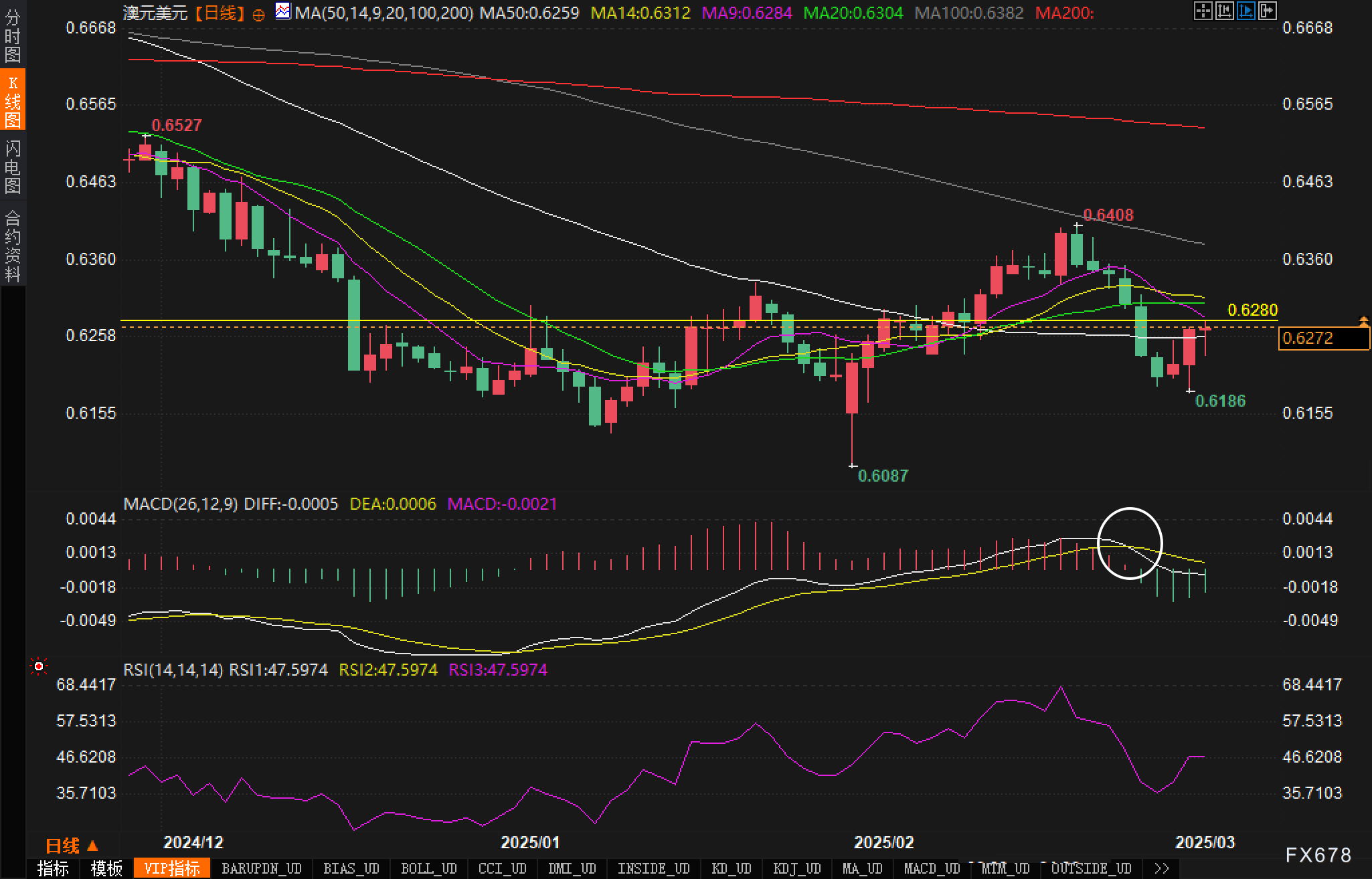 澳元兑美元近期正在测试关键阻力位0.6273-0.6280区域。从日线图表现看,价格在2月中下旬的一波反弹后再次承压,呈现出明显的技术弱势。