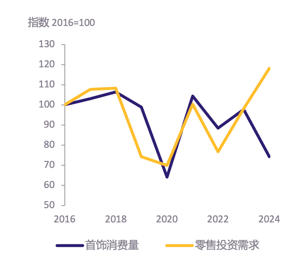 越来越多投资者通过在线社交平台获取到更多行业信息,因而从购买拥有准投资属性的黄金首饰转向购买金条,也推动黄金零售投资需求走强。不过由于2024年早期的基数非常高,加之今年金价飙涨,截至目前零售投资需求应同比下降。