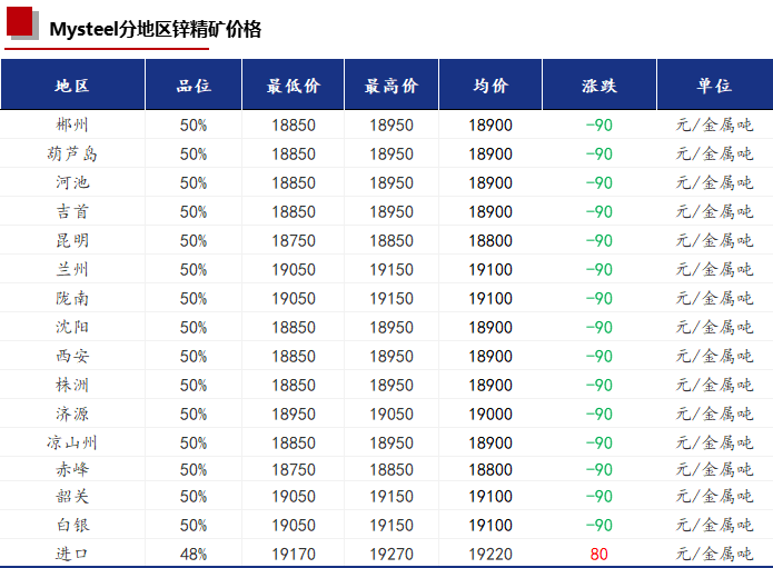 今日国内锌精矿加工费各地区均未调整,和上一交易日持平。受锌价的影响,锌精矿价格下降90元/金属吨。进口TC上调5美元/干吨,市场TC主流报价在10-20美元/干吨。
