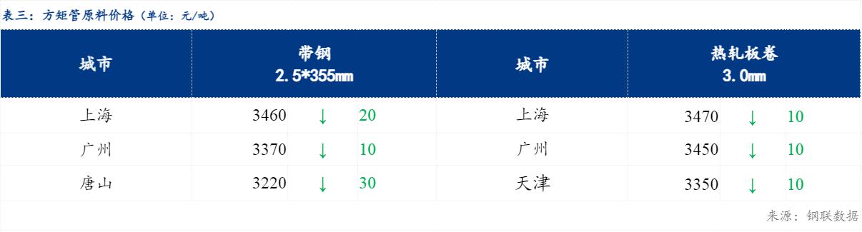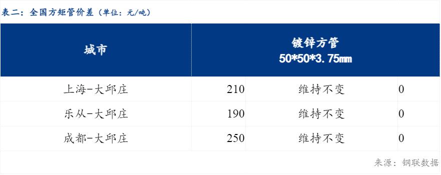 上海与大邱庄镀锌方管价差维持不变,乐从与大邱庄价差维持不变,成都与大邱庄价差维持不变。