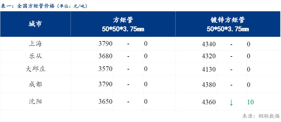 方矩管方面市场价格持稳运行;镀锌方矩管方面沈阳价格下跌10元/吨。