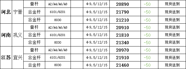 3月5日宁晋市场普铝杆现货报盘价20890元/吨,较上一交易日报价跌50元/吨;巩义市场普铝杆现货报盘价20910元/吨,较上一交易日报价跌50元/吨;宜兴市场普铝杆报盘价20970元/吨,较上一交易日报价跌50元/吨。