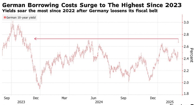 由于投资者准备迎接为国防和基础设施投资提供资金的政府融资出现历史性增长,德国债券暴跌,欧元飙升。德国10年期国债收益率一度上涨23个基点,至2.73%,创下2022年6月以来的最大涨幅,此前候任总理弗里德里希梅尔茨提出了全面的财政改革方案。欧元兑美元上涨0.6%,至1.0689,有望创下2022年末以来的最大三天涨幅,德国股市上涨,因投资者押注支出增加将提振欧洲经济。