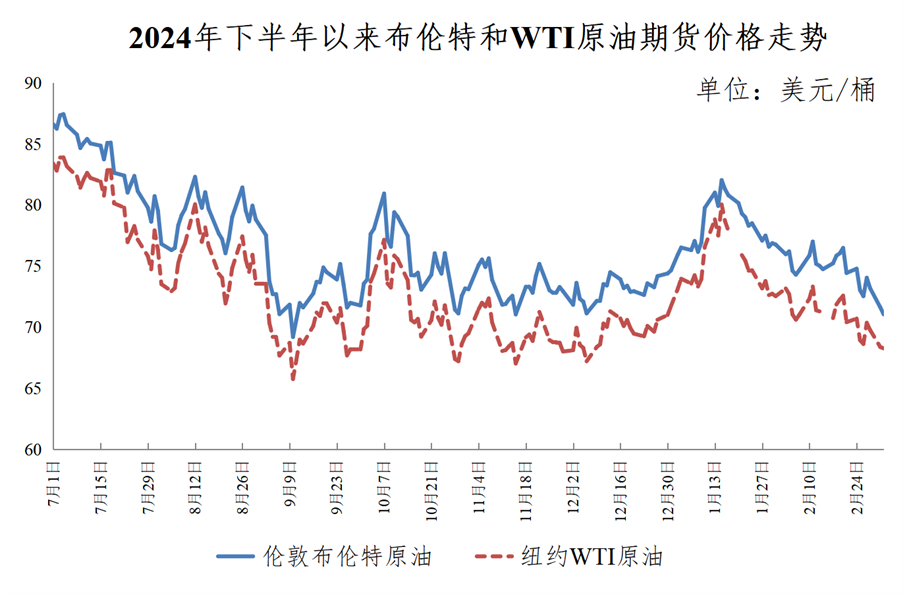 据国家发展改革委价格监测中心监测,调价周期内,供应增长和需求低迷预期影响国际油价震荡下降。以布伦特原油期货为例,价格从每桶76美元降至71美元,为近半年来低位。供应方面,根据美国能源信息署最新披露数据,美国原油产量已增至创纪录的1350万桶/日;美国贝克休斯能源服务公司数据显示,美国石油和天然气钻机数量连续五周增加,截至2月28日达到593个,意味着后期产量将继续增长。“OPEC+”产油国近期再次重申将按计划从4月份开始提高原油产量,这是其自2022年以来首次增产。需求方面,美国开始对加拿大和墨西哥等国加征关税,市场对由此可能导致的经济低迷和需求下滑产生担忧。