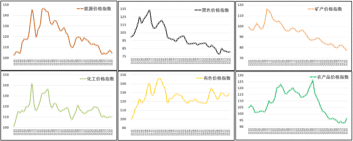 分行业看:农产品价格指数走高,报96.3点,月环比上涨3.5%,年同比下跌5.5%;有色价格指数止跌反弹,报128.6点,月环比上涨2%,年同比上涨9.5%;黑色价格指数止跌企稳,报80.6点,月环比上涨0.1%,年同比下跌11.9%;化工价格指数微涨,报110.1点,月环比上升0.01%,年同比下跌4.7%;能源价格指数小幅回落,报104.5点,月环比下跌2.3%,年同比下跌10.2%;矿产价格指数继续走低,报77.4点,月环比下跌2.7%,年同比下跌8.9%。