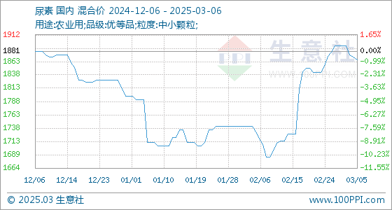 3月6日,生意社尿素基准价为1866.00元/吨,与本月初(1892.00元/吨)相比,下降了-1.37%。