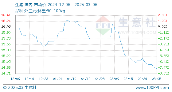 3月6日,生意社生猪基准价为14.85元/公斤,与本月初(14.97元/公斤)相比,下降了-0.80%。