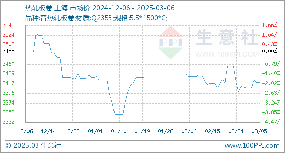 3月6日,生意社热轧板卷基准价为3420.00元/吨,与本月初(3408.00元/吨)相比,上涨了0.35%。