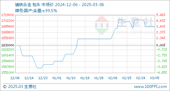 3月6日,生意社镝铁合金基准价为1685000.00元/吨,与本月初持平。
