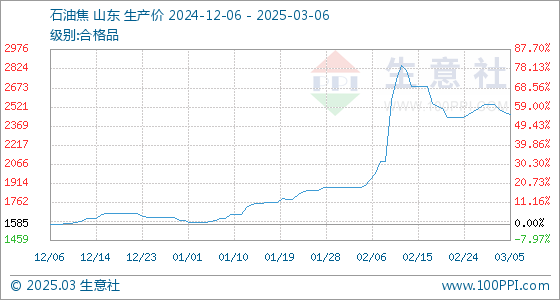 3月6日,生意社石油焦基准价为2463.50元/吨,与本月初(2545.00元/吨)相比,下降了-3.20%。