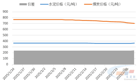 图3:2025年2月水泥价格、煤炭成本及价格差(元/吨)