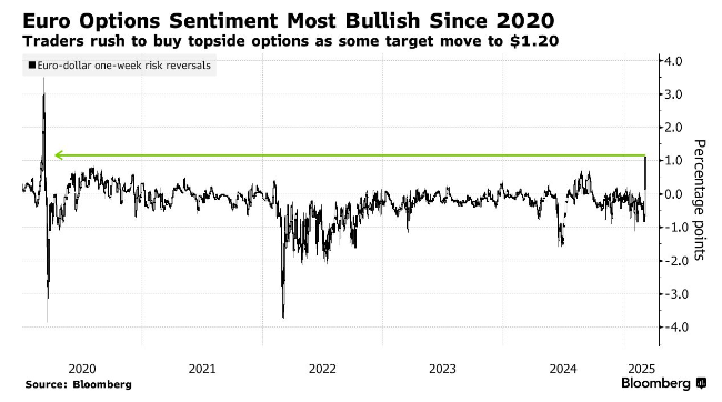 据熟悉交易情况的外汇交易员透露,对冲基金正在买入期权,押注欧元兑美元在六至九个月内可能升至1.20,这一水平上一次出现还是在2021年。