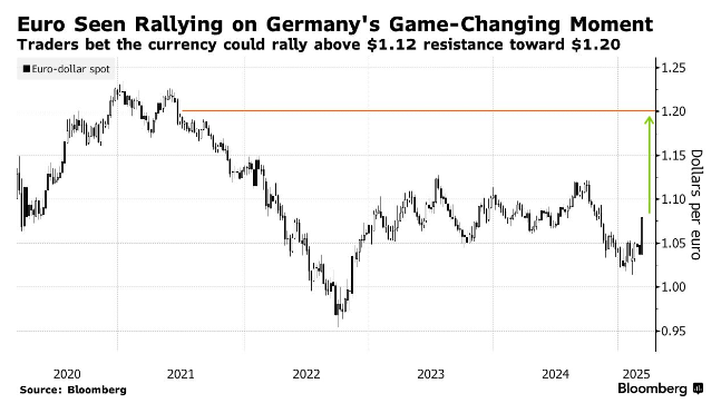 周三,欧元兑美元汇率上涨1.5%,至1.0789,创下四个月来新高,并录得自2015年8月以来最大的三日涨幅。此前,德国宣布计划投入数千亿欧元用于国防和基础设施支出。