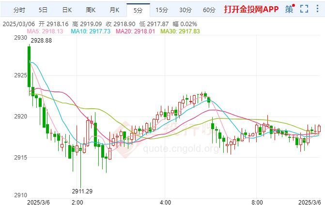 今日周四(3月6日)亚市早盘,现货黄金区间维持震荡走势,目前交投于2919.81美元/盎司,涨幅0.03%,今日金价开盘于2919.17美元/盎司,最高上探2920.22美元/盎司,最低触及2915.39美元/盎司。