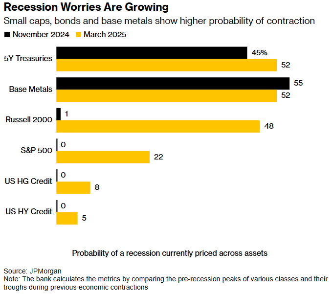 随着关税相关的不确定性和经济疲软指标在华尔街引发恐慌,金融市场发出信号表明经济衰退的风险正在增大。摩根大通的模型显示,市场隐含的经济衰退概率已从11月底的17%攀升至周二的31%。五年期美国国债和基本金属等关键指标显示,经济萎缩的可能性更高,而且胜负难分。尽管远非基本情况,但高盛集团的类似模型也表明,经济衰退风险正在上升,从1月份的14%升至23%。