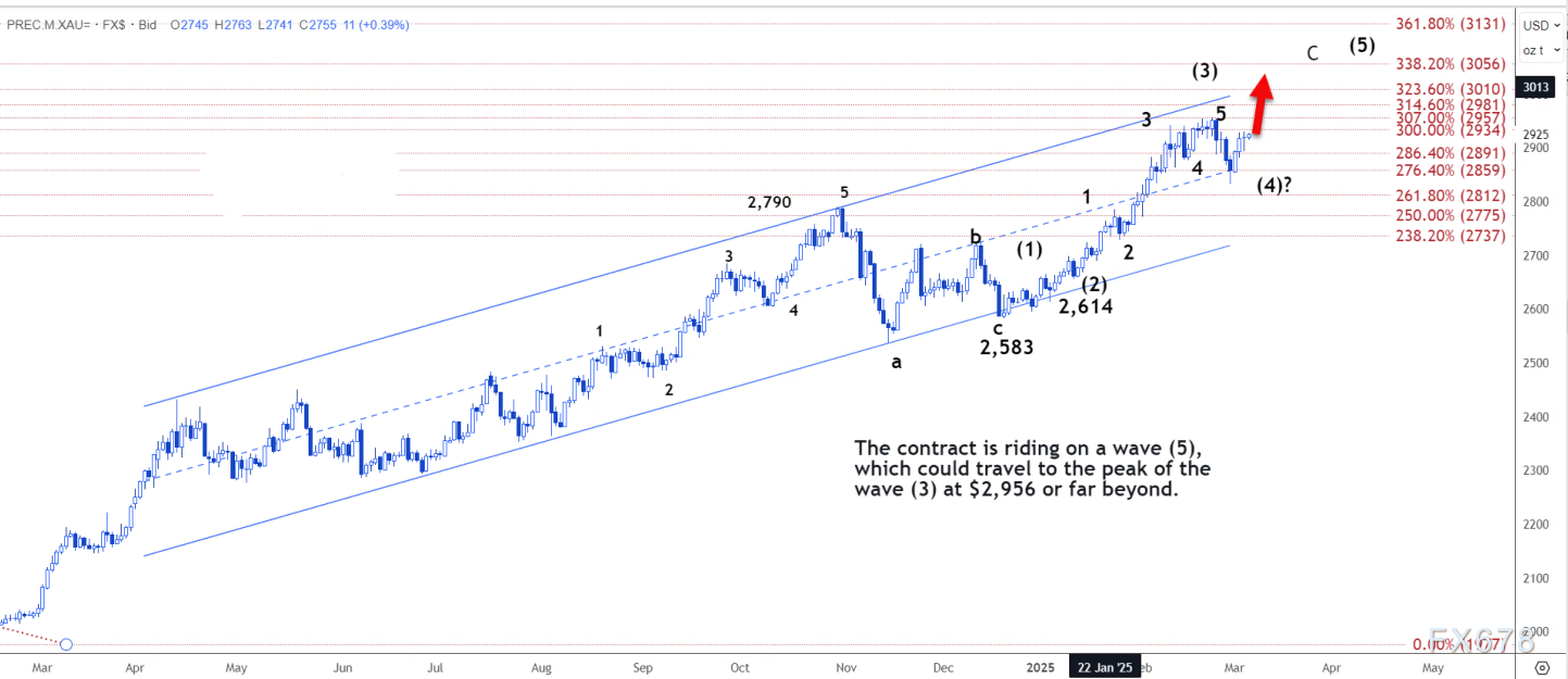 在日线图上,该合约正处于波浪(5)上,可能会达到波浪(3)的顶峰2956美元或更远。