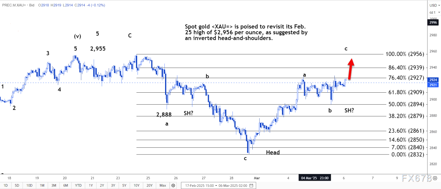 路透技术分析师指出,正如倒置头肩形态所暗示的那样,现货黄金有望重新回到2月25日的高点2956美元/盎司。