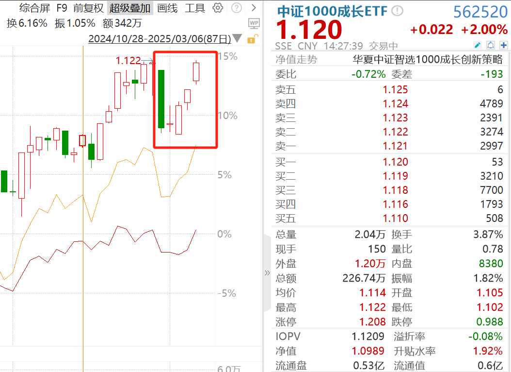 今日中证1000成长ETF上涨2.09%,4个交易日收复2月28日大阴线,强势特征明显。