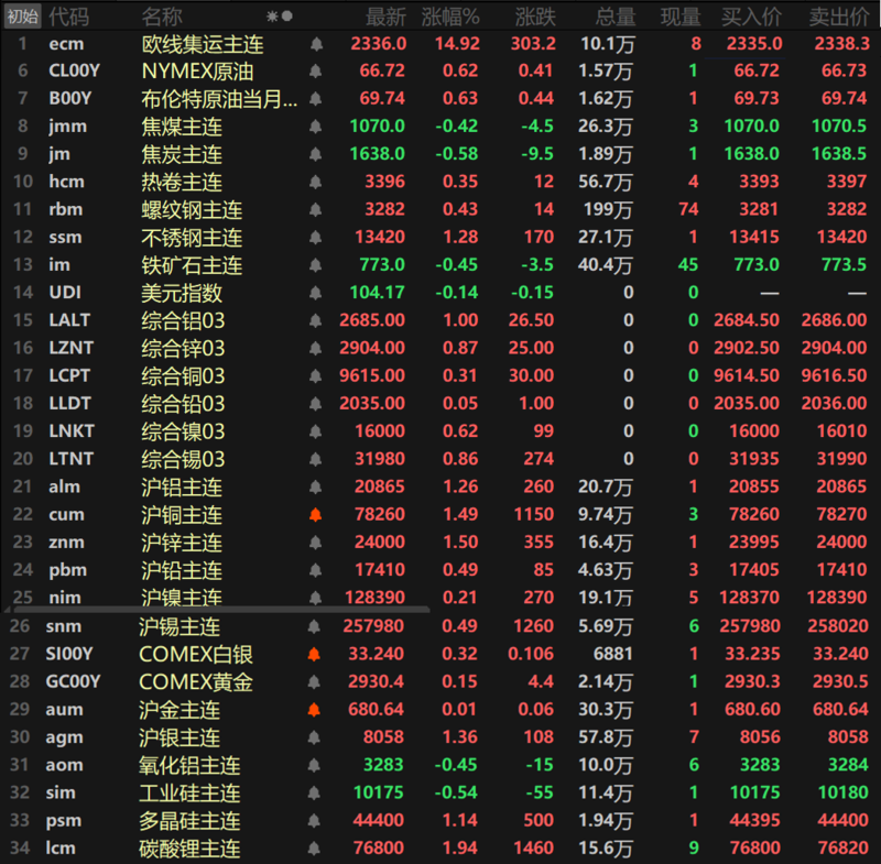 此外,工业硅主连跌0.54%,多晶硅主连涨1.14%,碳酸锂主连涨1.94%。欧线集运主连大涨14.92%。