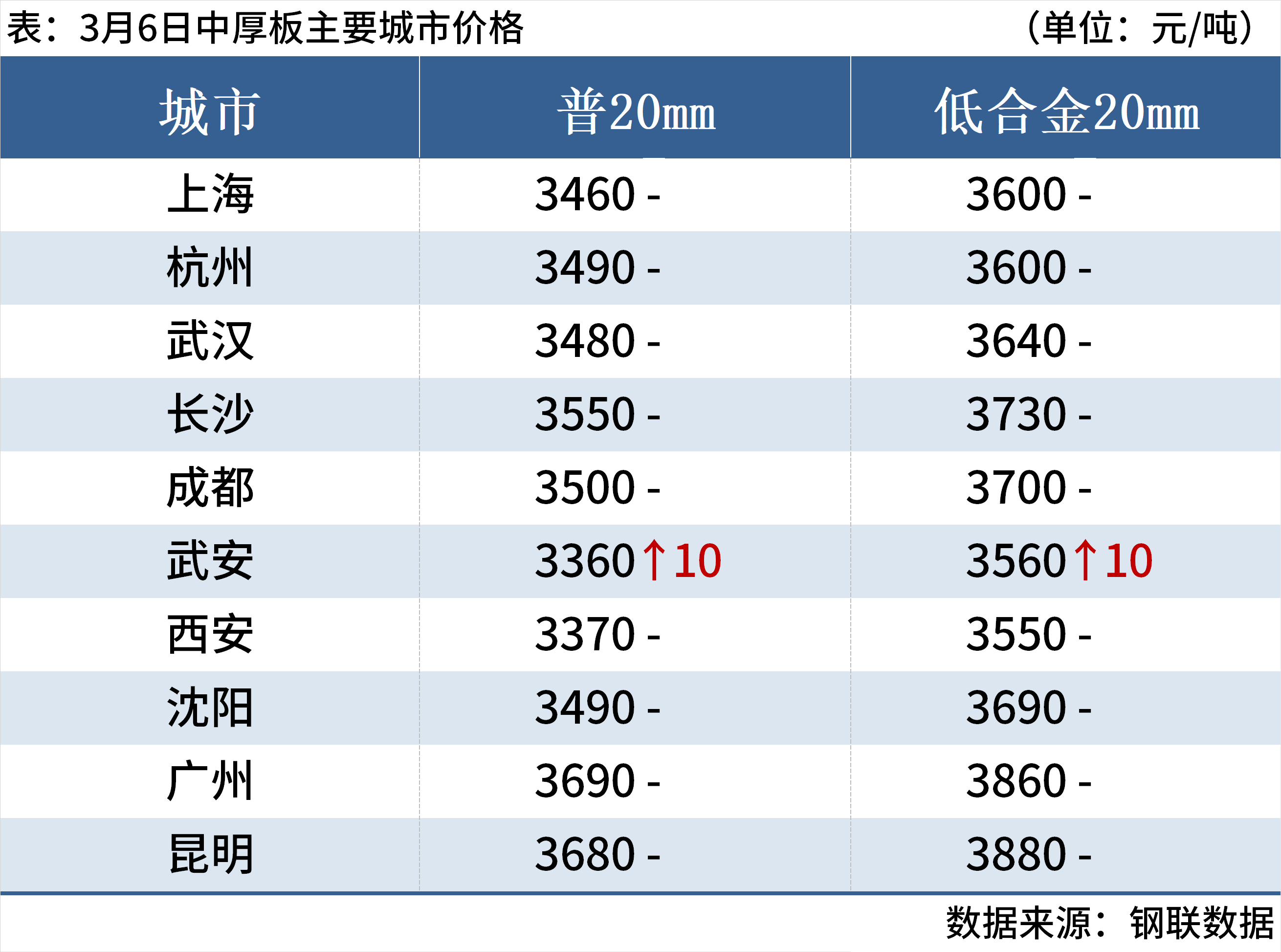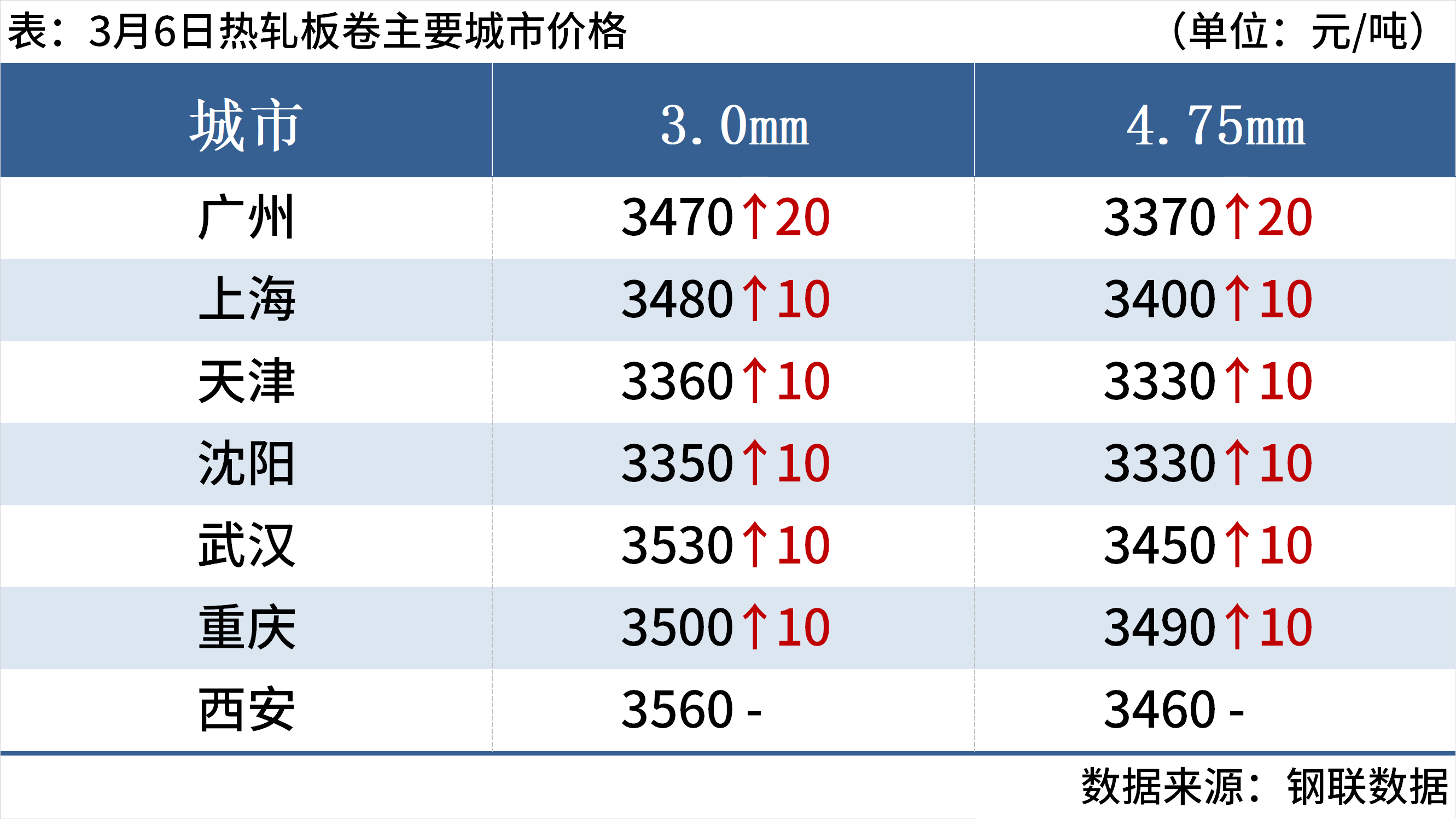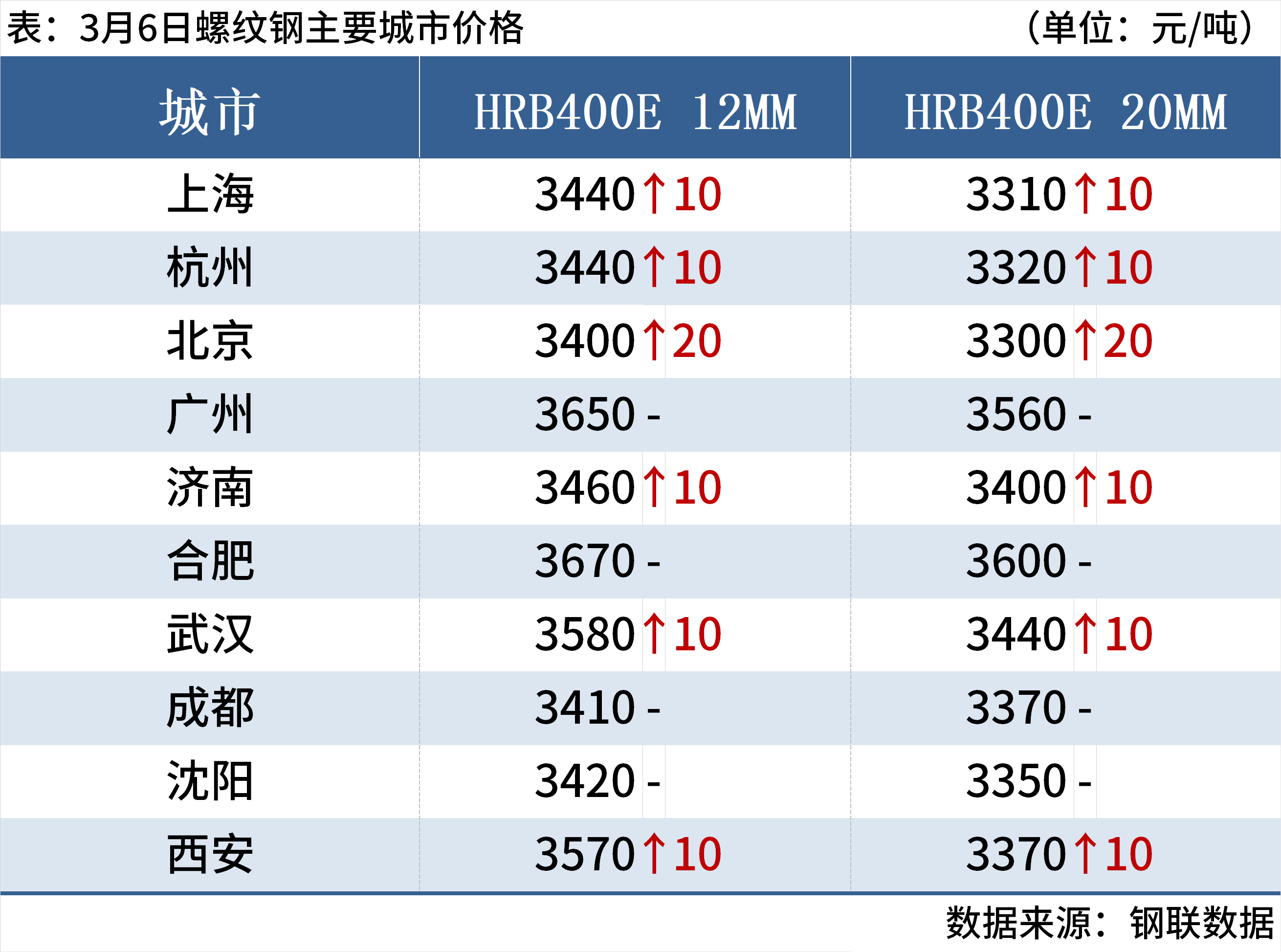 3月6日,国内钢材市场止跌反弹,唐山迁安普方坯资源出厂含税上调20报3060元/吨。6日期螺震荡翻红,市场情绪有所好转,现货市场成交表现活跃。