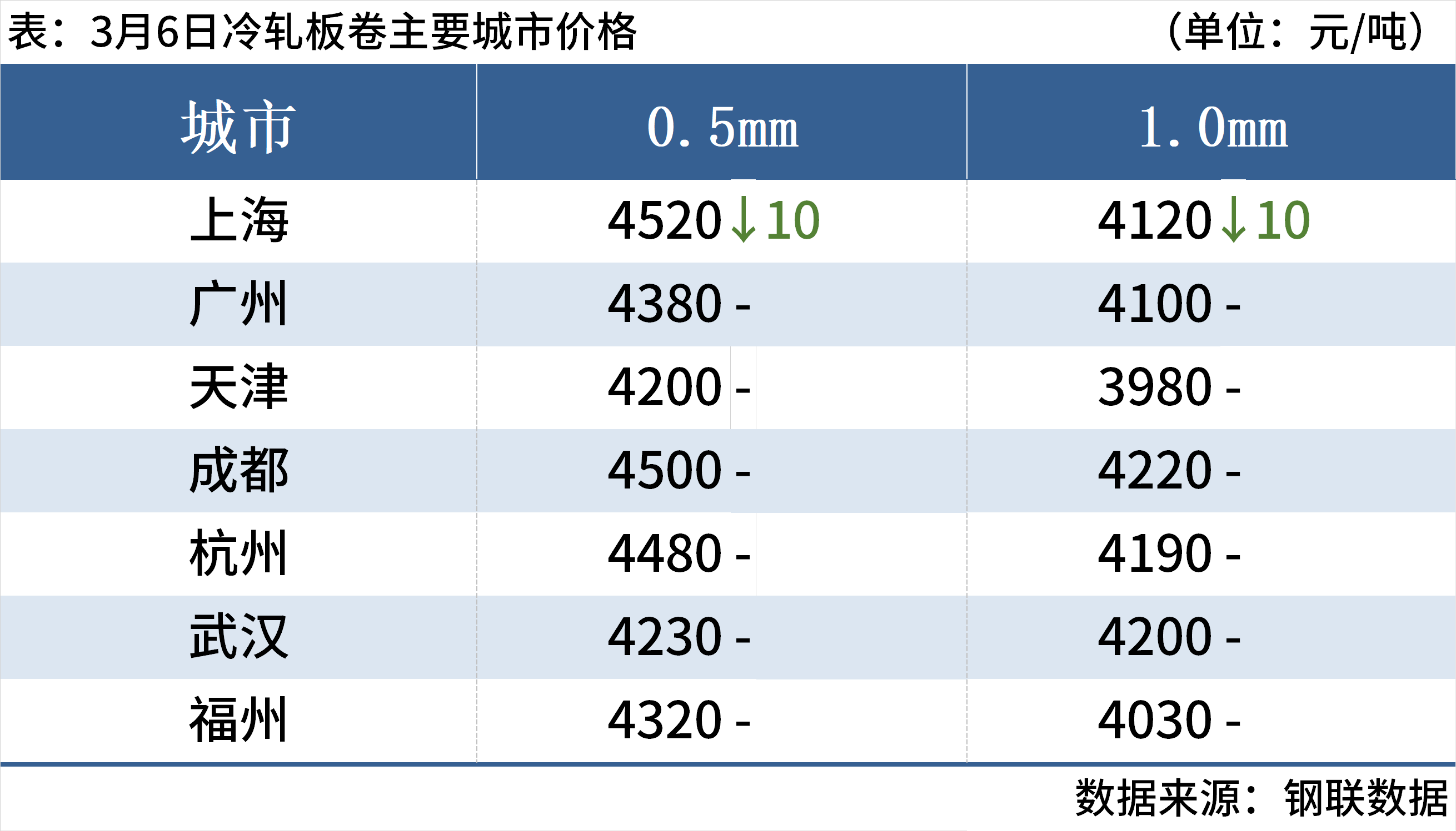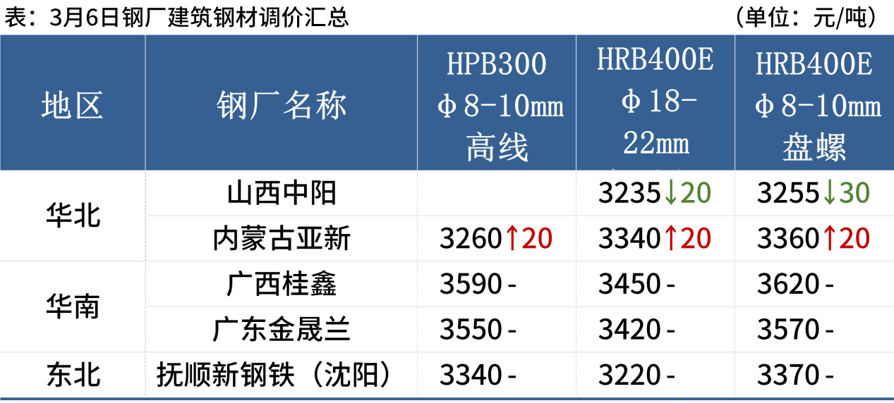 3月6日,国内1家钢厂上调建筑钢材出厂价20元/吨,1家下调20-30元/吨。