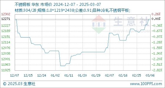 3月7日生意社不锈钢板基准价为12271.43元/吨