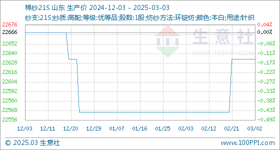 3月3日,生意社棉纱21S基准价为22633.33元/吨,与本月初持平。