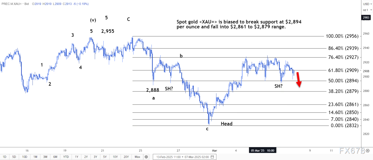 路透技术分析师指出,现货黄金有望跌破每盎司2894美元的支撑位,跌至2861美元至2879美元的区间。