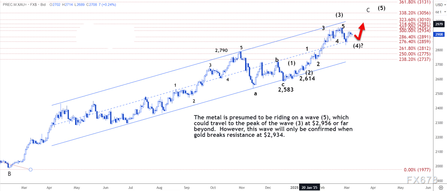 在日线图上,金价预计将乘着波浪(5)前行,可能达到波浪(3)的顶峰2956美元,甚至更远。